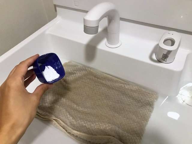 酸素系漂白剤であるオキシクリーンは、皮脂が原因の黄ばみに高い効果を発揮します。洗面台の排水口に栓をして40度から50度くらいのお湯をため、規定量の粉末を溶かします。そのまま30分から1時間ほど放置してつけ置き(液に浸したままにする方法)をするだけで、成分が汚れを浮かせます。